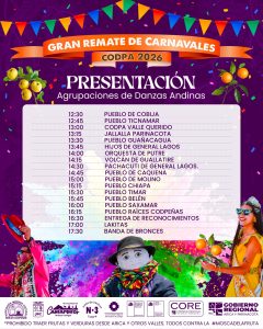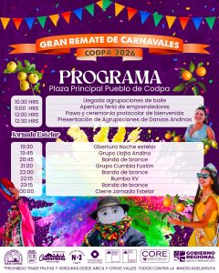 En la segunda versión del Remate de Carnavales en Codpa agrupaciones invitadas y comparsas llenarán las calles de color, bailes y ritmos ancestrales, reflejando todo el espíritu andino que nos identifica y nos une como comunidad.